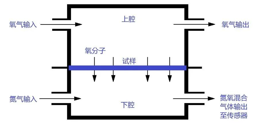 Y310 2.0 氧氣透過率測定儀采用庫侖電量法原理。預(yù)先處理好的試樣固定在測試腔中間,高純氧氣在薄膜的上腔流動(dòng),高純氮?dú)猓ㄝd氣)在下腔流動(dòng),氧分子透過薄膜擴(kuò)散到另一側(cè)的氮?dú)庵校涣鲃?dòng)的氮?dú)鈹y帶至傳感器,通過對傳感器測量到的氧氣濃度進(jìn)行分析,從而計(jì)算出氧氣透過率。