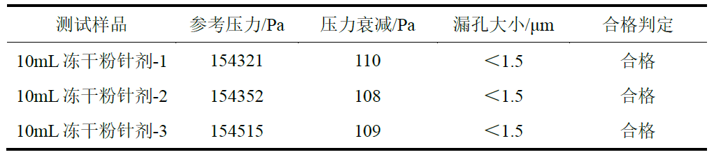 (1)針對此次測試的10mL凍干粉針劑,壓力衰減法在AUTO GBM-L2 雙壓法微泄漏密封測試儀中的檢出限在2 μm,達到《化學藥品注射劑包裝系統密封性研究技術指南》中文獻報道檢出限>1.0~5.0 μm級別,優于微生物挑戰法,滿足包裝系統密封性的檢測需求。