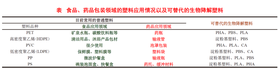目前,可用于食品藥品的生物塑料包裝材料主要有:淀粉基生物塑料(指淀粉含量15%以上的通過填充、共混塑料及全淀粉塑料);聚乳酸PLA;聚羥基脂肪酸酯類(PHA)、聚丁二酸丁二醇酯(PBS)、乙酸纖維素等。如下表所示: