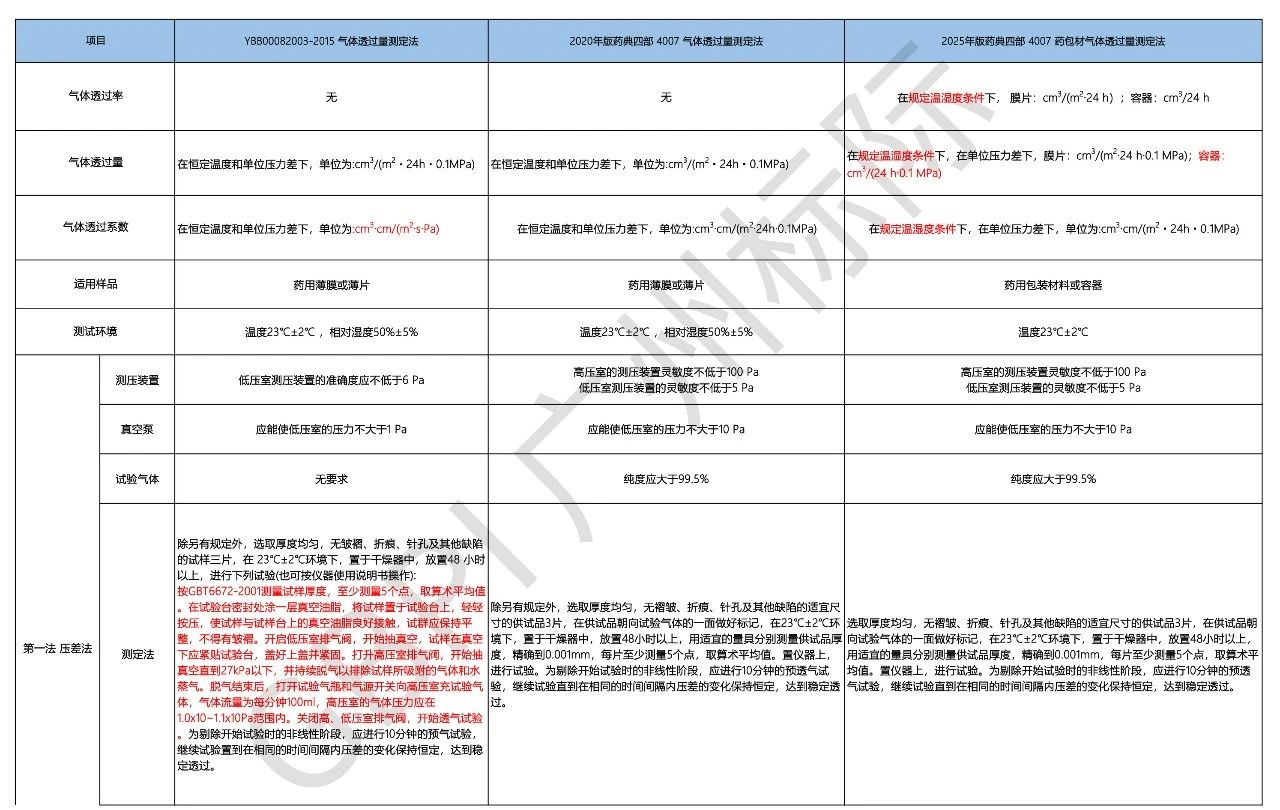 筆者現就2025版中國藥典4007 藥包材氣體透過量測定法,2020版中國藥典 4007 氣體透過量測定法以及YBB00082003-2015 氣體透過量測定法展開對比。為藥包材企業,制藥企業等相關企業藥包材質量控制提供綜合對比方案以及合規應對策略。