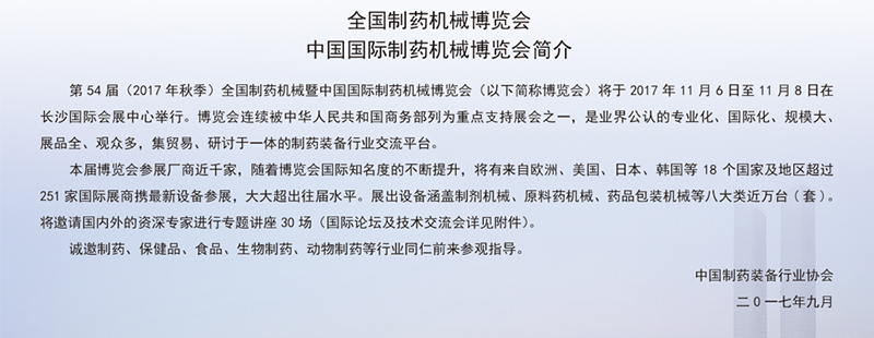 【展會邀請】2017年第54屆中國國際制藥機械博覽會