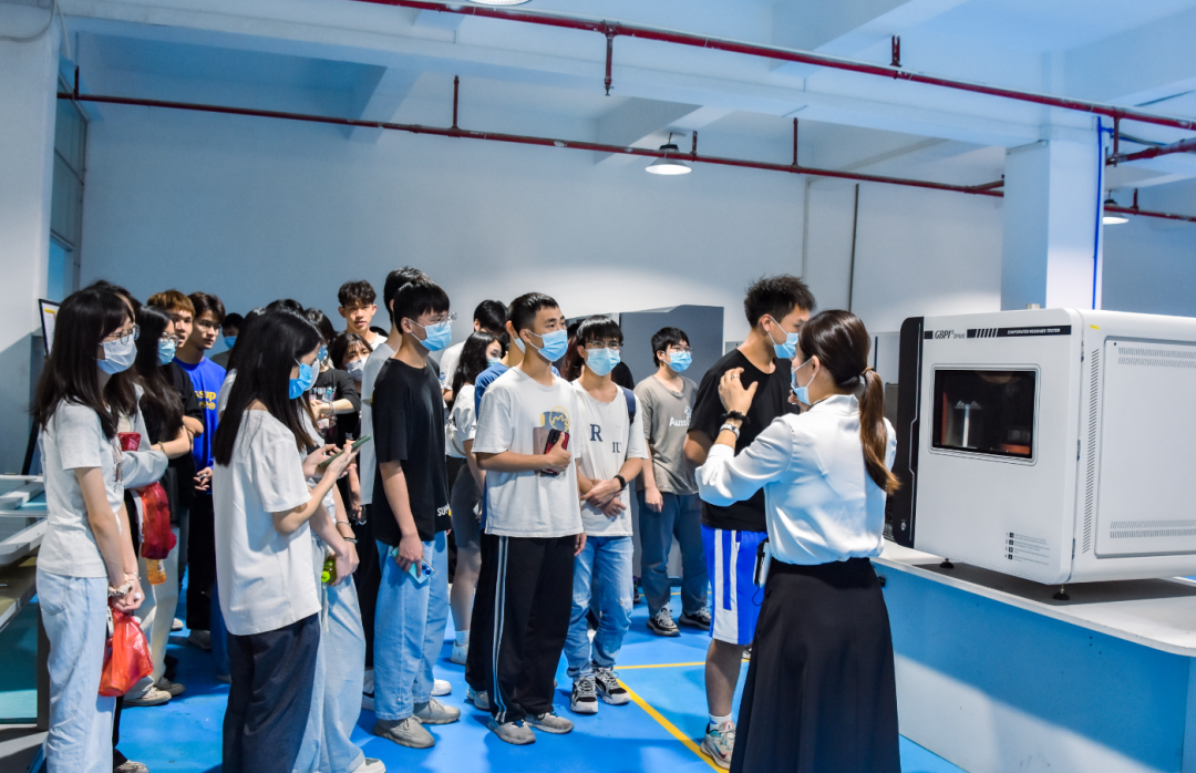 在黃經理的陪同下,毛老師一行先后參觀了參觀了標際CNAS實驗室、阻隔性能檢測儀器實驗室、基礎儀器生產車間、數字化實驗室、應用場景綜合展廳等場地。在應用場景綜合展廳中,GBPI標際儀器設備品類齊全、科技感十足令同學們贊嘆不已,引發了同學們極大興趣。在黃經理的詳細介紹和指引下,同學們對展廳儀器設備進行了認真觀摩和仔細了解,并興致勃勃的展開交流探討,氣氛融洽熱烈。